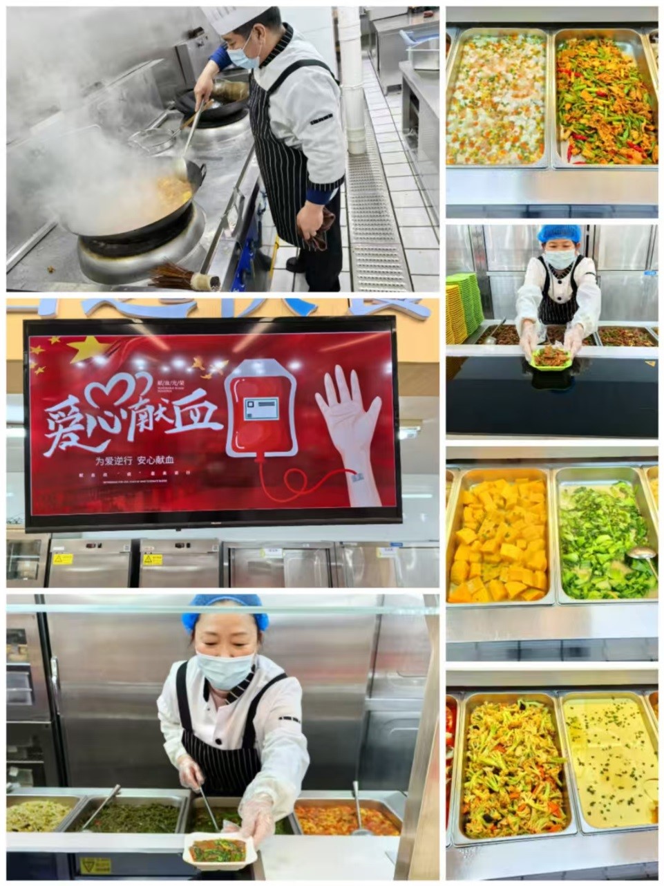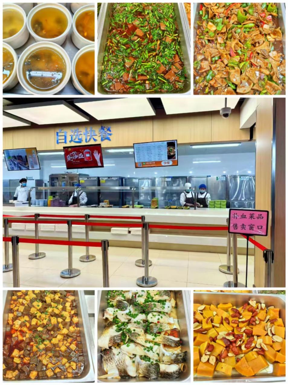 科桥餐饮公司为了让献血后的同学们能够及时补充营养,精心设计了补血菜单。从富含铁元素的菠菜、猪肝和鸭血,到蛋白质丰富的炖鸡蛋、清蒸鱼、虾仁烩豆腐和虫草鸡汤等,每一道菜品都经过了精心挑选和烹饪,为献血的同学们提供了丰富多样的营养选择。同时,餐饮公司还专门设立了补血营养菜品窗口,方便同学们快速获取营养美食。考虑到献血过程中同学们可能会出现体力不支的情况,餐饮公司贴心地在献血活动当天准备了红糖水,一杯杯红糖水,传递着浓浓的关爱,让献血者们感受到了学校的温暖。