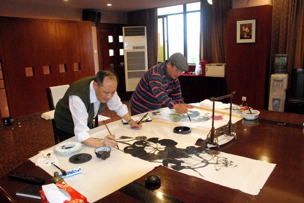 学院工会主席孙群对代表团的到来表示热烈欢迎,并结合PPT向代表团成员具体介绍了学院的发展历程、近几年来学院的发展情况以及学院目前的专业建设、基建项目、校企合作、招生就业、成人培训、工会特色等情况。接着,他和艺术家们进行了亲切交流,表达了对老艺术家的崇高敬意,并祝愿他们身体健康,永葆艺术青春。艺术家们也真诚祝愿学院有更快的发展和美好的前景。画家余人和朱德强还即兴泼墨作画赠与学院,两位画家的作品设色、用笔、用墨皆见功力,勾花点叶,颇有情趣,洒脱豪放,又清丽劲健,深受大家的赞美。全体与会人员在两位画家的作品前合影留念。
