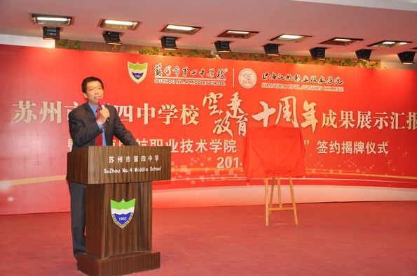 仪式上,于院长谈了对孕育和培养了钱钟书等一批杰出人才的百年名校——苏州市第四中学的印象,对感受到的美丽校园中独特而深厚的文化底蕴表示赞赏。他简要介绍了职业教育的特点和发展趋势,重点介绍了我院空中乘务专业的专业优势和注重学生实践能力培养、与行业无缝衔接的教学特点;希望以共建优质生源基地为契机,不断加强两校间的相互联系,密切合作,共享教育资源,为培养输送优秀人才共同努力。杨副院长代表学院与苏州市第四中学校校长张剑华签订了《合作办学协议书》。于院长与苏州市教育局领导共同为“生源基地”揭牌。