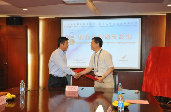 继学院与普惠公司、波音改装公司成功签署校企合作协议后,2014年6月5日下午,学院又成功联手扬子江快运航空有限公司(以下简称扬子江公司),双方隆重签署校企合作协议,以互信共赢为合作理念,未来在机务人才培养、“维修培训基地”建设、科技研发、学生就业以及技术互援方面将展开全面合作。签约仪式由孙暄副院长主持,扬子江公司董事长舒伟东、副总裁刘忠清和于再院长、孙群副书记出席签约仪式,相关中层领导陪同出席,