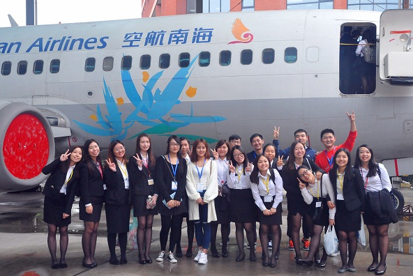 在下午的参观讨论环节,空港管理系派出24名学生与香港的80名同学一起分成8组,参观了航空服务开放实训中心楼、空乘实训中心、停机坪、机务实训中心。香港师生对我院一流的实训设施表示赞叹。