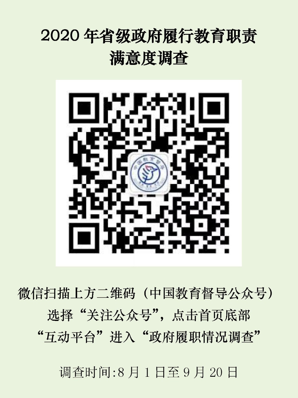 参与方式:微信扫描下方中国教育督导微信公众号二维码,选择“关注公众号”,点击首页底部“互动平台”进入“政府履职情况调查”。