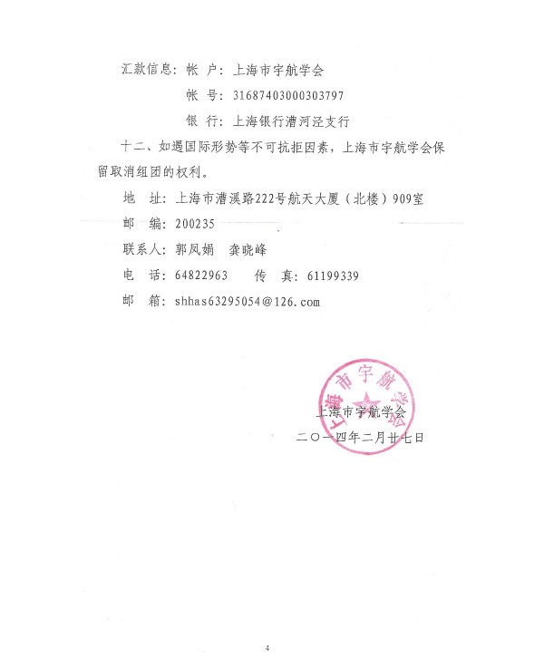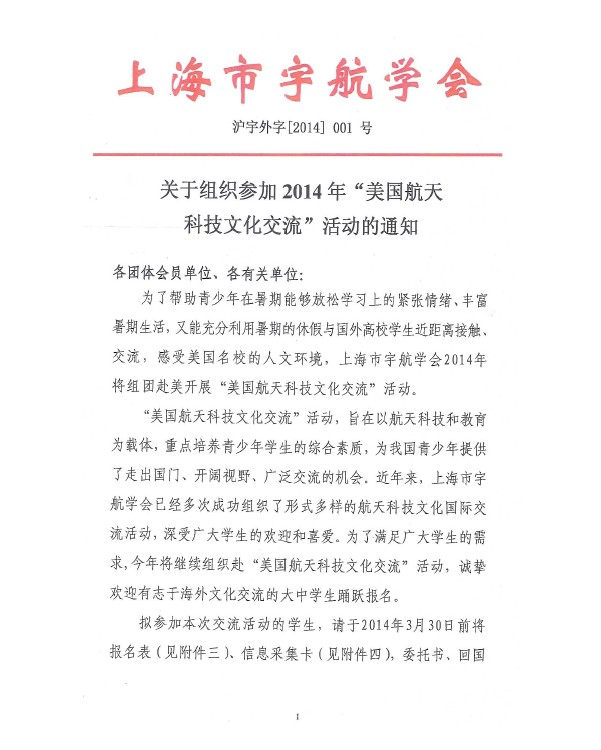 通知公告 best365官方网站登录入口 > 通知公告 > 通知公告 关于组织参加2014年“美国航天科技文化交流”活动的通知 作者:best365官方网站登录入口浏览:时间:2014-03-04 附件: 附件一至附件四为2014美国航天科技文化交流活动日程安排及相关表... 附件: 附件五:美国航天科技文化交流活动简介