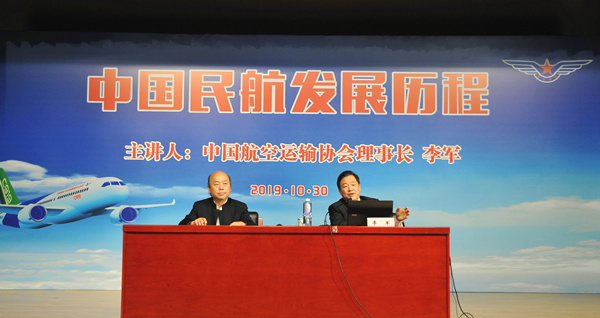 在近三个小时的辅导报告时间里,李军理事长从1909年中国民用航空起步溯源,浓缩了110年来中国民航的发展历程,特别是新民中国航的发展进程、改革开放以来民航持续快速发展等历史阶段,脉络清晰,史料翔实,内涵丰富,为学院师生和民航兄弟单位同志们上了宝贵的一课,全场用一次次的热烈掌声表示感谢。