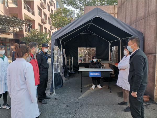上午9:30,应急演练正式开始。第一部分是“门岗管理”。在学校正门口,针对校门管控开展了校外人员进校、学生外出、学生实习返校三种场景的现场演练。第二部分是“学生日常发热处置”。在学生宿舍园区,模拟了学生突发发热症状后的应急处置。演练全程紧张有序,各部门分工明确、配合密切、行动快捷、准确高效。