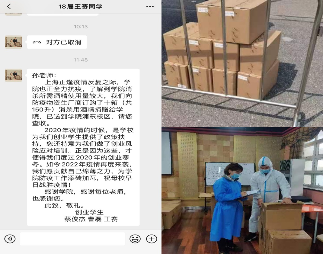 4月20日,我院3名毕业生——蔡俊杰、曹磊、王赛订购了10箱共计150升消杀用酒精捐赠给学院,点对点送达浦东校区后,后勤保卫处按照校园安全防疫规定做好接收工作,并对他们雪中送炭的一片赤诚之心表示感谢。