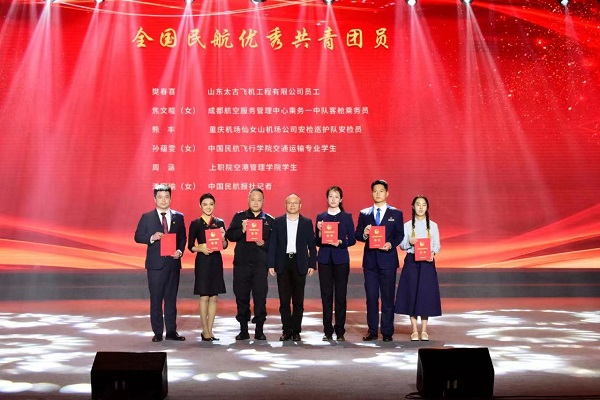 韩钧为全国民航优秀共青团员获奖代表颁奖(右二为周涵)