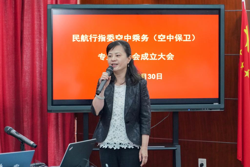 冯润娥在会上致词,介绍了民航行指委专业委员会成立的背景、专业委员会的工作职责,对职业教育民航空乘空保专业人才培养提出了三点要求,一是要服务行业,二是要推进教育现代化,三是要培养四好学生。冯润娥指出目前民航行指委已有包括空中乘务(空中保卫)3个专业委员会举办了成立大会,对其他5个专业委员会的成立具有示范引领作用。她希望空中乘务(空中保卫) 专业委员会在民航行指委领导下,站在全局高度,认真履行职责,联系企业、指导院校,搭建平台,共享成果。最后冯润娥宣布专业委员会正式成立。