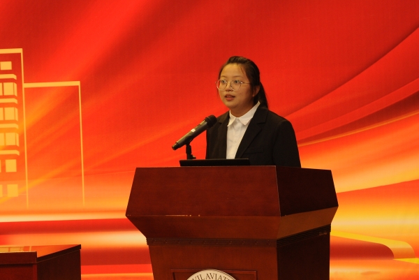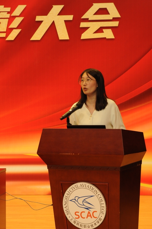 颁奖仪式后,围绕“师德”主题,学院第二届“师德标兵”的同事或学生依次上台,开展了“师德标兵”先进事迹专题报告。他们从实际案例出发,既谈思想、又谈工作,引起了全体教师的共鸣,进一步激发了学院教师加强师德建设的自觉性。紧接着,2221101班同学杨振宇代表全体同学对学院领导和老师们春风化雨般的教诲表示衷心的感谢。她在发言中表示,学院的发展离不开老师们默默无私的守护和付出,学生的成长也离不开老师们的引航和助力,她号召同学们跟随敬业、严谨、务实、仁爱的老师们的脚步,努力成为助力民航强国建设的高素质高技能人才。