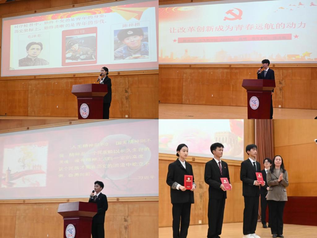 经过6位评委老师综合评审打分和400名现场学生观众的投票,最终选出一等奖3名,二等奖5名,三等奖6名,韩玉锦宣读了比赛结果,曹维平、李君、朱川慧分别为获奖同学颁奖。同时,王一帆等8名同学成为新一届马克思主义学院学生宣讲团的新成员,柳心欢现场为入选的同学颁发了聘书。陈乐代表学生宣讲团成员发言中回顾了宣讲团至去年成立以来取得的工作成绩,对新成员的加入表示最热烈的欢迎,表示在校大学生是富有朝气和梦想的一代,要在时代大潮中自觉扛起宣讲大旗,宣讲团成员要做好政策的“金话筒”、理论的“轻骑兵”,激励更多民航学子在自己的人生道路上坚定信念、追逐梦想。