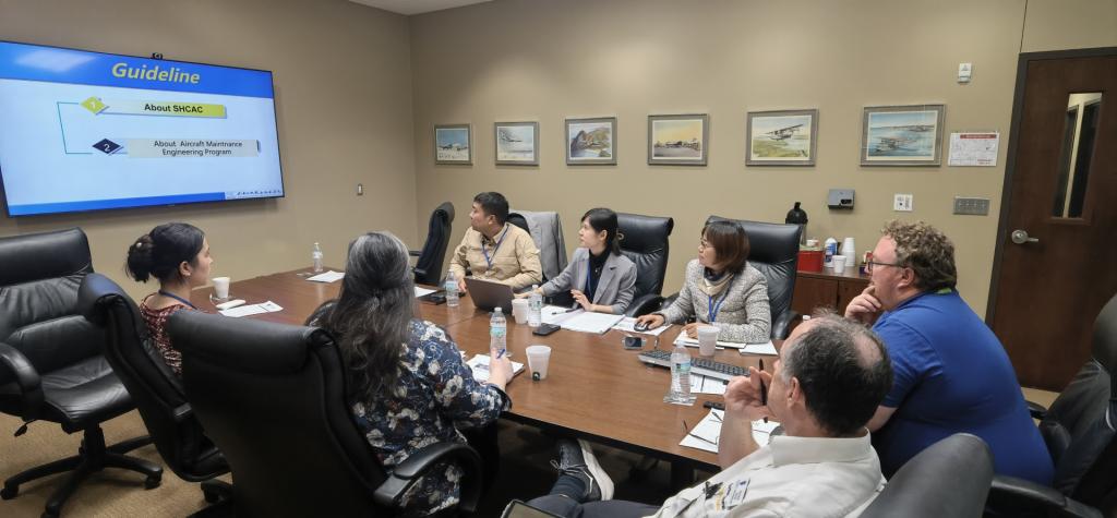 访问首日,代表团先后来到莱托诺大学主校区以及Abbott航空中心(该校的航空与航空科学学院所在地)进行参观访问,并分别与莱托诺大学国际部副总裁Alan Clipperton、国际发展部总监Sarah Epling、航空与航空科学学院院长David Tesser、副院长Sean Fortier等校方代表,就合作项目的合同续约条款、本轮办学周期项目实施情况以及项目后续优化方案进行了深入探讨。罗玉梅首先向美方代表详细介绍了学院近年来的发展情况以及项目在本轮办学周期的运行情况。她提到,在本轮办学周期内,虽然受疫情影响,本项目赴美留学的学生数量较上一轮办学周期有所减少,但从今年的招生情况来看,项目招生计划完成良好,报到率超95%,反映了学生对该项目的心理预期正在向好发展。在本轮办学周期中,中美双方学校合作沟通良好,项目总体运行平稳。针对双方在项目下一轮办学周期的合作,双方研讨进一步拓展合作领域和合作内容,比如增加交换生项目、师生短期交流互访、学分互选等合作内容。针对项目的进一步优化,双方就项目人才培养方案优化、学生外语能力和跨文化交流能力提升、学分转换、奖学金额度提高等内容展开了深入沟通与交流,形成了项目优化的初步方案。