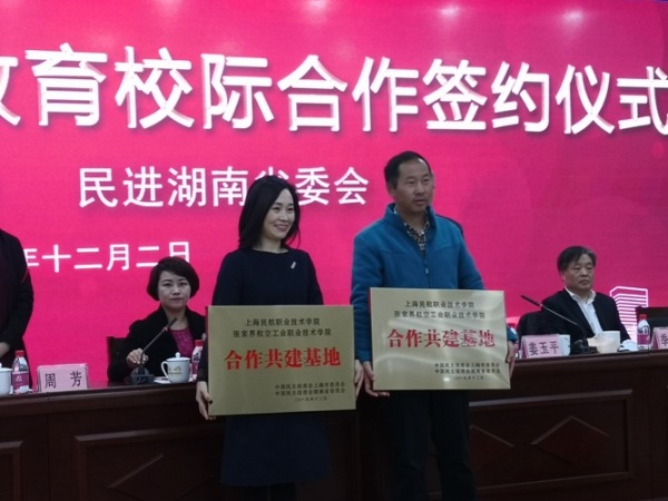 12月2日,民进上海市委、民进湖南省委2019沪湘两地校际合作签约仪式在张家界航空工业职业技术学院学术报告厅举行。签约仪式上,我院与张家界航空工业职业技术学院签署框架合作协议并接受“合作共建基地”授牌。签约仪式的成功举行标志着本次对口帮扶共建工作迈入正式实施阶段。