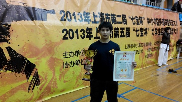 空手道亦称空手,被列入了亚运会竞技项目之一。空手道比赛大致分为型及自由组手两大类。型是以假设的对手为目标,单人进行空手道技术的预定动作表演练习;自由组手即为对打比赛。此次交流大会为本市大学生练习空手道提供了交流学习的平台,旨在通过互相切磋健身技艺,达到自我提升综合素质的目的。我院在空手道社的基础上选拔了由吴立威、包易立、宋佳程、龙昕昕、黄安琪和焦旸6位同学组建参赛队伍,由体育教研室副教授朱雷亚老师担任技术指导并带队出征。在交流大会现场,我院的参赛队员向在场的评委很好地展现了空手道的基本功法,包含踢、打、摔、拿、投、锁、绞、逆技、点穴等多种技术,举手抬足间力道十足,技术运用的速度和技巧恰到好处,让现场观众零距离地感受到了空手道运动的独特魅力。傍晚,2013年上海市第五届“七宝杯”大学生空手道交流大会在夜色中落下了帷幕,经过激烈拼搏,最终吴立威同学荣获大学男子一般组重量级冠军,黄安琪同学荣获大学女子白带组重量级季军,成绩喜人。