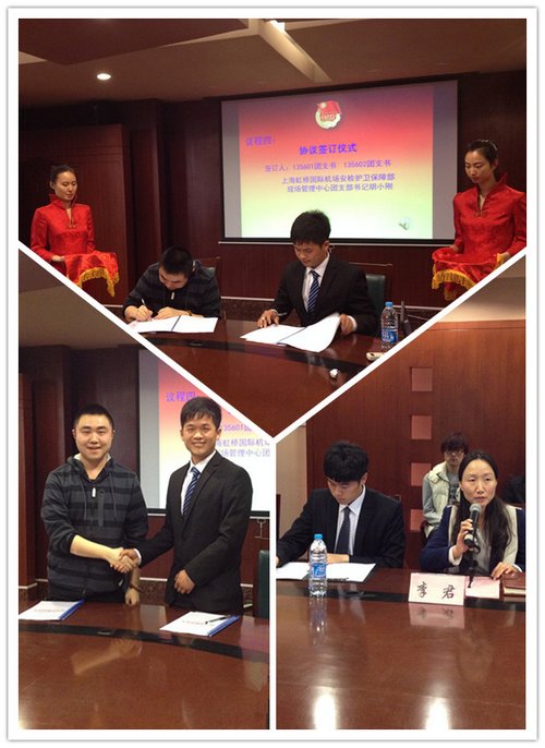 继上学期我校1251、135101团支部成功与东航工程技术公司浦东维修基地定检维修分部发动机车间机械一组签订了校企团支部共建协议、开拓校企交流新平台之后,3月28日下午,又一场校企团支部共建仪式在第一会议室隆重举行,我校135601、135602团支部与上海虹桥国际机场安检护卫保障部现场管理中心团支部签订了校企团支部共建协议。上海虹桥国际机场安检护卫保障部现场管理中心团支部书记胡小刚、长宁区青年文明号号长周盛炜出席了此次签约仪式,我校团委副书记李君、学生一科科长周凌之和135601、135602班辅导员等共同出席了此次仪式。