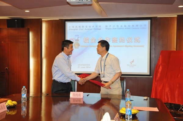 继学院与普惠公司、波音改装公司成功签署校企合作协议后,2014年6月5日下午,学院又成功联手扬子江快运航空有限公司(以下简称扬子江公司),双方隆重签署校企合作协议,以互信共赢为合作理念,未来在机务人才培养、“维修培训基地”建设、科技研发、学生就业以及技术互援方面将展开全面合作。签约仪式由孙暄副院长主持,扬子江公司董事长舒伟东、副总裁刘忠清和于再院长、孙群副书记出席签约仪式,相关中层领导陪同出席,