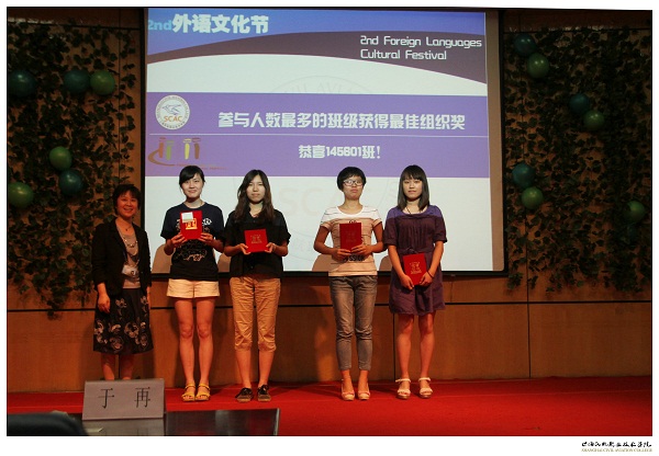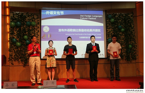 随后大会对第二届外语节各项赛事进行了颁奖。各赛事项目的负责老师为三等级获得者颁发了荣誉证书,基础部主任曾晓燕、团委书记李君老师为二等奖的选手颁发了荣誉证书,于再院长为一等奖获得者颁发了荣誉证书并致闭幕辞。
