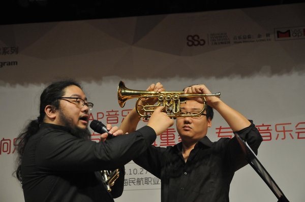 10月27日下午,作为学院首届校园文化艺术节系列活动之一的“MAP音乐地图-上海交响乐团‘东方铜管五重奏’专场音乐会”在学院新礼堂如期举行。来自上海交响乐团的小号首席夏非、长号首席胡清文、圆号演奏员谢叶林、小号演奏员李笑男、大号演奏员Alexander LILIPPOV为我校师生带来了一场高水平的铜管五重奏演出。