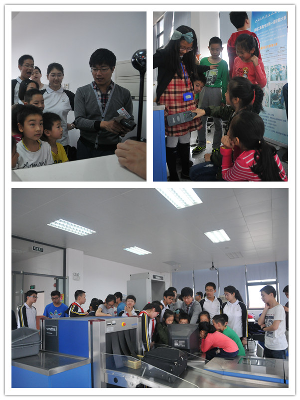 邵咏亮老师以提问的方式展开民航安检常识的普及,他认真介绍了安检现场的常见仪器和各自的用途以及每一个安检岗位的职责。随后,师生相互配合下,现场演示了一名旅客在机场接受安全检查的整个流程,模拟了安检过程中可能出现的各种情形。接受现场的简单指导和训练后,小朋友们有的拿起了手探,有的站在射线图像识别显示器前,轮流体验了证件检查、人身检查、X射线机图像识别、开箱包检查等环节,真实感受着安检职业的乐趣。