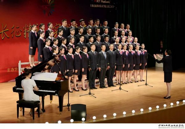 此次艺术节正逢红军长征胜利80周年,为了纪念这段伟大的征程、缅怀革命先辈,学院以主旋律合唱比赛作为艺术节的收官之作在闭幕式上推出。此次比赛经由系部初赛和选拔,最终每个系部报送一支队伍参加决赛。每个参赛队演唱两首歌曲,一首必唱歌曲,一首自选歌曲,演唱曲目均为红色主旋律歌曲。经过抽签,1号参赛队为空港管理系,演唱的曲目是《毛委员和我们在一起》、《强军战歌》;2号参赛队为航空乘务系,演唱的曲目是《红军战士想念毛泽东》、《浏阳河》;3号参赛队为航空运输系,演唱的曲目是《*线》、《我的中国心》;4号参赛队为航空制造系,演唱的曲目是《过雪山草地》、《歌唱祖国》;5号参赛队为航空维修系,演唱的曲目是《报喜》以及《三大纪律八项注意》。