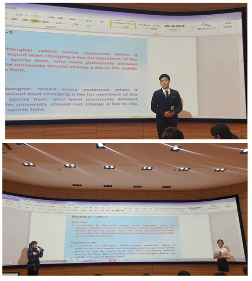 在最终辩论中,杨慧琳与刘一鸣两位同学沉着冷静,立论稳固,展示了扎实的英语基本功、标准的语音语调、丰富的词汇量、流利的语言表达能力和机智的现场应变能力,获得了评委老师的一致好评,现场数次响起掌声。同学们的优异的表现与平时的积累密不可分,他们正像鲁迅所说的那样,“把别人喝咖啡的时间都用在了学习上”。方世达同学观摩了整场比赛,他表示获益良多,对未来的就业与发展都大有裨益。
