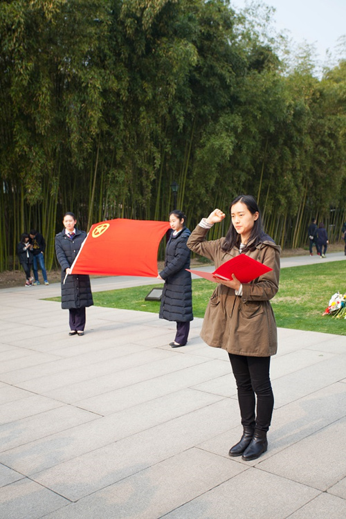 随后,同学们排着两列纵队来到“四·一二”殉难者广场,在航空乘务系辅导员余慧老师的带领下举行了重温入团誓词活动。我校53名团员青年骨干在团旗下,庄严地举起右手,重温入团誓词,重新感受入团仪式的庄严、光荣和喜悦。