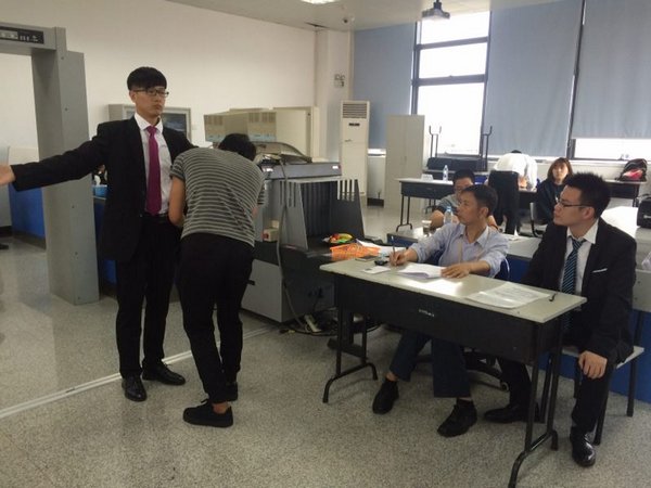 技能鉴定考试分理论和实操两个考核科目,理论考试采用笔试的形式,实操考试则是采用与岗位接轨的模拟操作考核。在航服实训中心安检实训室分别进行了验证检查、人身检查和开箱包检查三个操作项目的考核,着重考查学生安检技能的实际运用能力,包括对有效乘机证件的识别、登机牌的核查、旅客的人身检查、托运行李开箱包检查、违禁物品的识别与处置等。考核中,绝大多数同学表现出了较好的考试状态,向各地考评员展示了民航学子优良的精神面貌和业务素质,赢得了考评员的好评。
