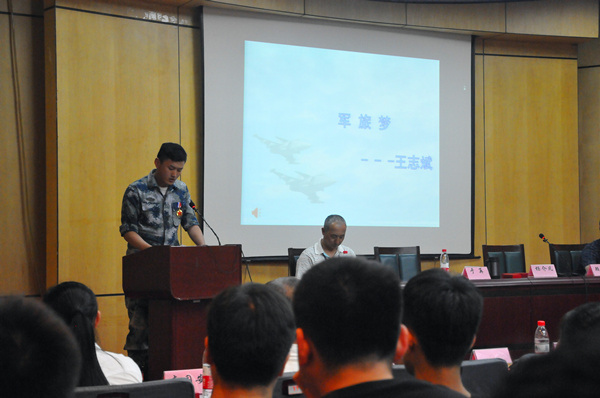 王志斌代表退伍学生士兵发言,讲述了他的“军旅梦。2014年,他如愿戴上了红花,穿上了“天空蓝”,从迈入军营的第一步的到成为班长,从熟悉军旅生活到退出现役,他感叹从军的日子美好单纯而又短暂,也让人迅速成长。他用几句话概括了在部队的收获,一是爱国情怀存心底;二是知识技能提升快,学习动力鼓得足;三是亲情友情更珍惜,人生路上有明灯。短短的从军生涯让他成为了真正的男子汉,去迎接新的挑战。他以一位退伍的大学生士兵的身份欢迎同学们加入军队这个大家庭,在部队里贡献青春,在部队里建功立业,实现人生价值.
