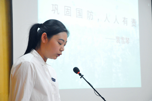 空港管理系航空旅游服务专业2班的裴雪琴同学作为今年应征参军的学生代表发言。她表示,我们这一代青年生长在一个和平的年代和国度里,认为战争离自己相距甚远,其实在现实中,区域战争和冲突随时都可能爆发,国防并不是一个遥远的话题。青年大学生积极参军,捍卫共和国的主权和领土完整,是历史赋予我们的重任,也是有志青年应该履行的义务。她号召同学们正确认识国防的内涵,青年大学生是祖国的未来,也是国防建设的重要组成力量,国家的安定与否,与当代大学生的爱国热情,国防观念和献身精神密不可分。她期待成为一名真正的军人,实现心中的理想,勇敢担起前辈们的重担,在国家需要的时候挺身而出,保卫祖国的和平。