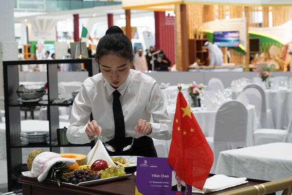 “餐厅服务里面,首先体现的是一种西餐文化和西餐生活方式,在我们的理解里,餐厅服务员只做餐厅前厅的一些事情,给客人斟酒上菜等简单的(服务)。但在世界技能大赛,它是对厨房有要求的,要求一名选手全面掌握餐厅所有岗位的技能。”陈蕴说。