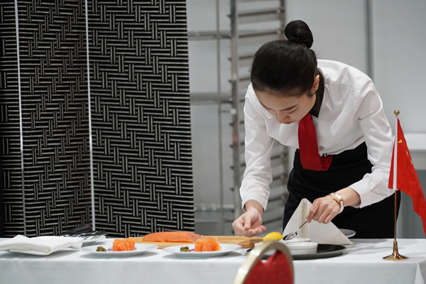 休闲餐比赛中,摆盘三文鱼。