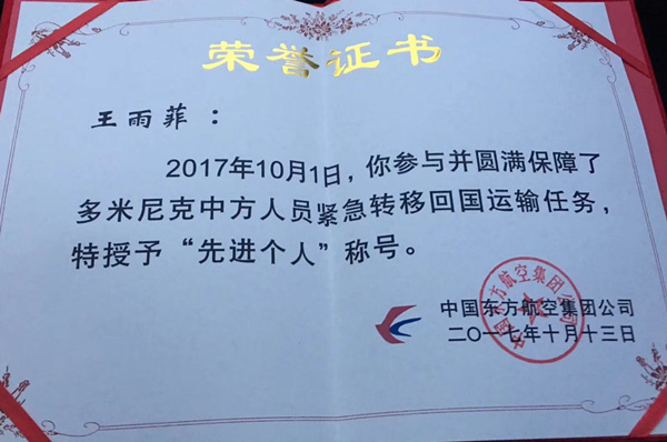 10月13日,中国东方航空公司召开了“当祖国和人民需要的时候”——东航圆满完成多米尼克中方紧急转移回国运输任务报告会。会上,机组、地勤代表讲述了此次撤侨任务的经历,参与并圆满完成了此次任务的王雨菲被授予“先进个人”称号。