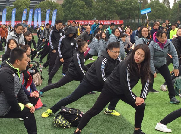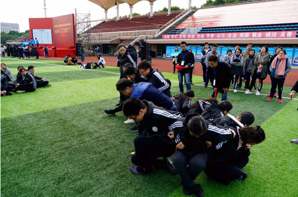 上午9时,开幕式在上海工程技术大学操场准时举行。开场讲话结束后,紧接着就是热身运动,上海工程技术大学的国家一级健美操运动员带领全体辅导员们伸展四肢,拉伸关节,活动肌肉,为即将到来的各项比赛最好准备。