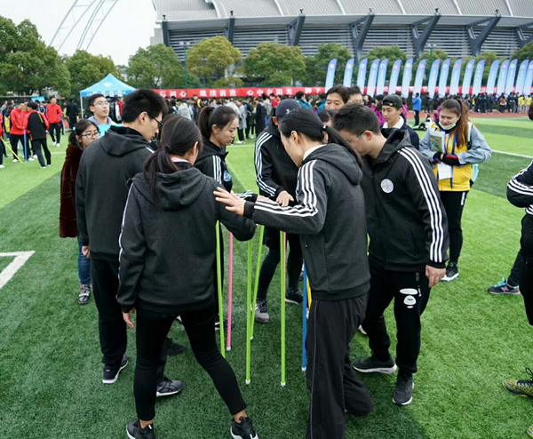 紧接着的项目是“不倒森林”,同样是一场考验眼力、应变能力、配合能力等的比赛。参赛的队员要依次稳定住手中的“森林”走完一圈,耗时最短者,赢得比赛。对于这项运动,口令至关重要,口令喊的好,大家的节奏就会把握的好,就不容易失误。团队派出有着丰富经验的余慧老师担当行令官。“一二,一二…”在准确的口号和节奏下,团队以10秒多的历史最好成绩完成了比赛。