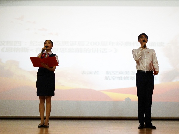今年正值马克思诞辰200周年,本次演讲比赛还特别加入了对伟大的无产阶级革命导师马克思致敬的环节。演讲比赛正式开始前播放了短片《初心》,学院优秀学生干部代表宁一和张琪崑随后朗诵《在马克思墓前的讲话》,以此表达民航学子对马克思主义科学真理的坚定信念。