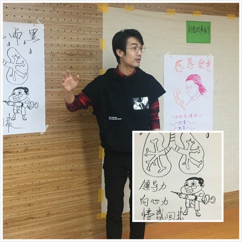 接下来是体验团队的热度,制作封面故事和宝藏地图。大家5人分成一组,在小组内由记者把故事梗概简述,然后一起讨论并选择一个最能代表和打动他人故事,并设计故事封面。在之前人们分享的经验故事中,大家很快选定了三个故事和代表人物:赵冬艳老师小组的《一盏明灯》、徐添老师小组的《风里雨里》、郭培凤老师小组的《感恩欣赏》。辅导员工作的故事各种各样,感动却是一样的。沿着这些,我们一起寻到了正向核心的宝藏,可以带回生活与工作、可以带向未来的资源。