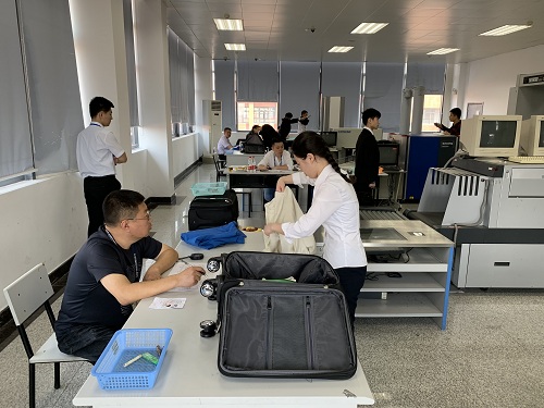 技能鉴定考试分理论和实操两个考核科目,理论考试采用笔试的形式,实操考试则是采用与岗位接轨的模拟操作考核。在航服实训中心安检实训室,分别进行了验证检查、人身检查和开箱包检查三个操作项目的考核,着重考查学生安检技能的实际运用能力,包括对有效乘机证件的识别、登机牌的核查、旅客的人身检查、托运行李开箱包检查、违禁物品的识别与处置等。考核中,同学们都表现出了较好的考试状态,向各地考评员展示了我院民航学子优良的精神面貌和业务素质,赢得了考评员的好评。