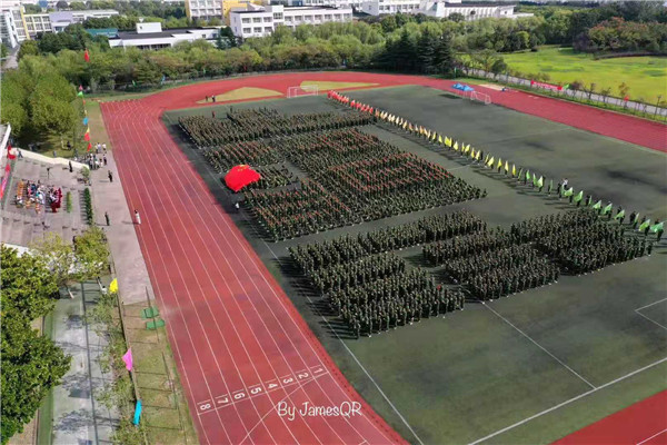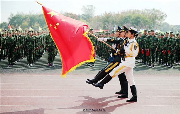 王子明教官一声令下,向新中国70华诞致敬方队迅速举旗,高喊“我爱你中国!”,紧接着参加此次军训的2600余新生共同歌唱“我和我的祖国”,拉开了本次军训成果汇报的序幕。