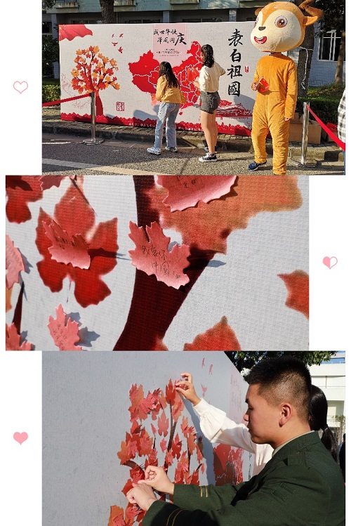 在表白祖国区,学生心理发展协会创新设计了看谜面猜祖国地名、喊出对祖国的爱、表白祖国贴纸、留言枫叶等形式多样的表白活动。同学们可以写出对祖国的爱,也可以喊出对祖国的爱。大家纷纷在表白祖国的总展板前留影以庆祝祖国母亲的生日。