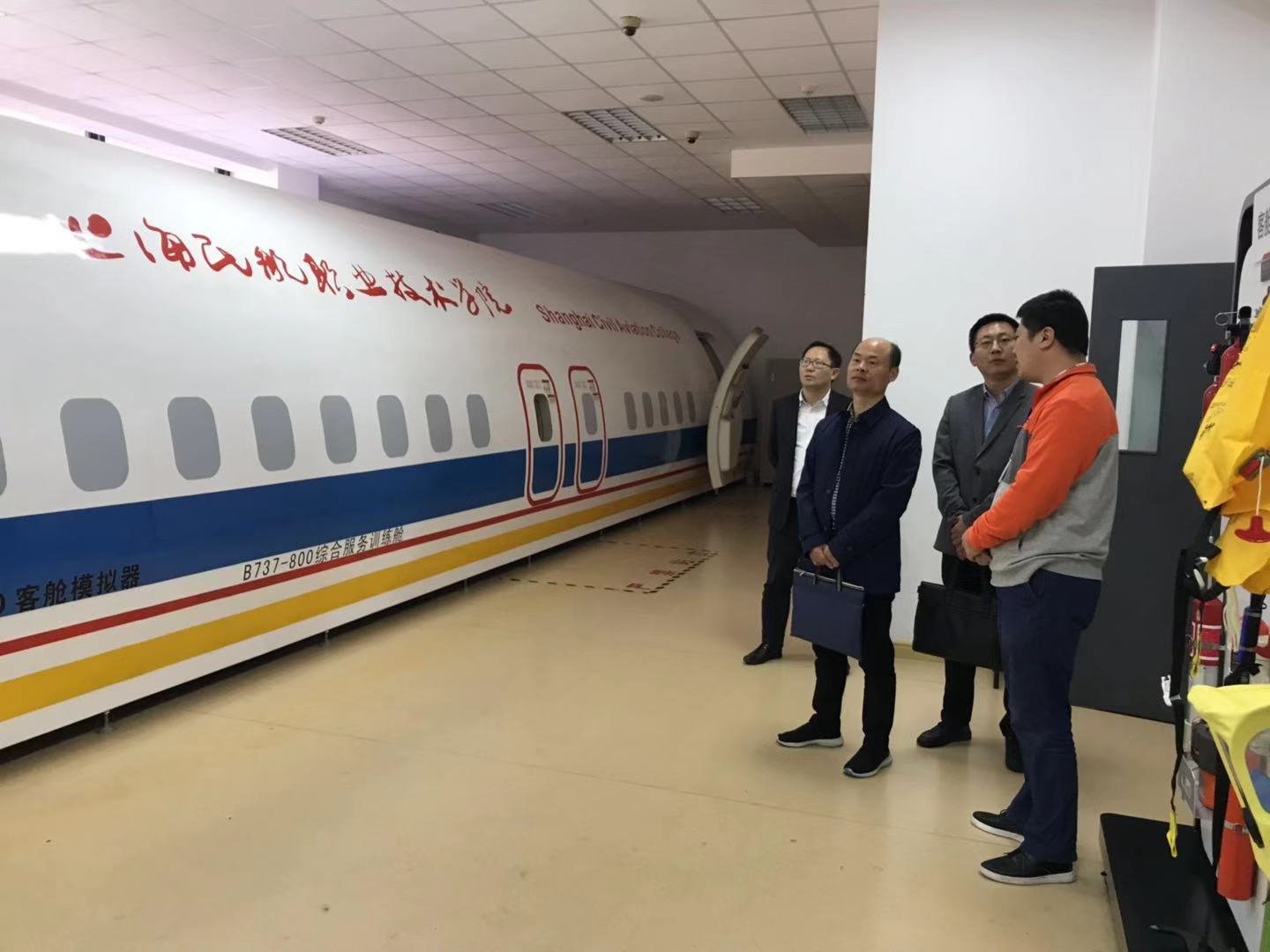 交流结束后,潘泉荣副书记与耿贵林部长在就业指导中心杨必忠主任的陪同下,参观了学院乘务实训中心和机务工程实训中心的相关教学装备。两位远道而来的贵宾对学院标准化、专业化的教学装备赞不绝口,同时也对学院规范化管理和民航专业技术人才培养的模式表示肯定。
