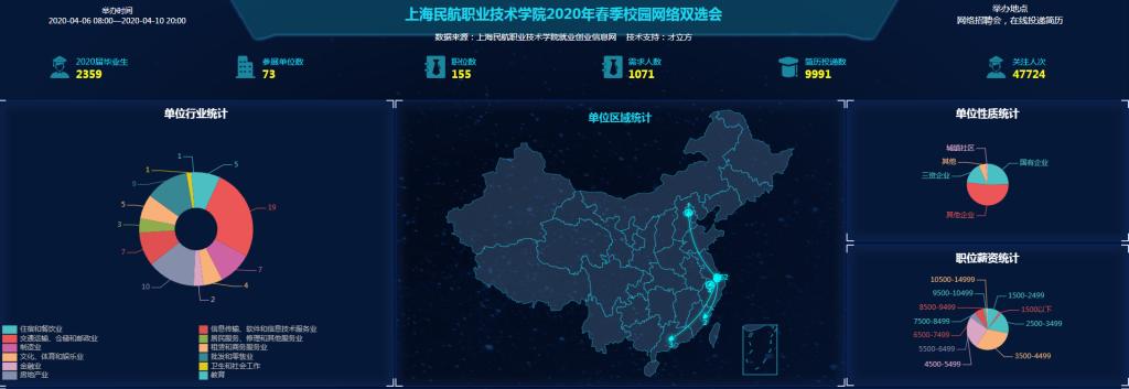 2020年春季校园网络双选会,是学院就业创业新系统上线以后第一次大规模进行线上网络双选会。此次双选会共有73家单位参加,提供155个职位,1071个岗位数量,其中国有企业18家、三资企业12家。73家企业分布12大类行业,主要包括交通运输业、制造业、服务业、零售业等。公司位于上海的有61家,北京市1家、浙江省4家、广东省3家、福建省2家。截至4月8日上午,共有979位学生投递了简历,企业收到简历7000多份。