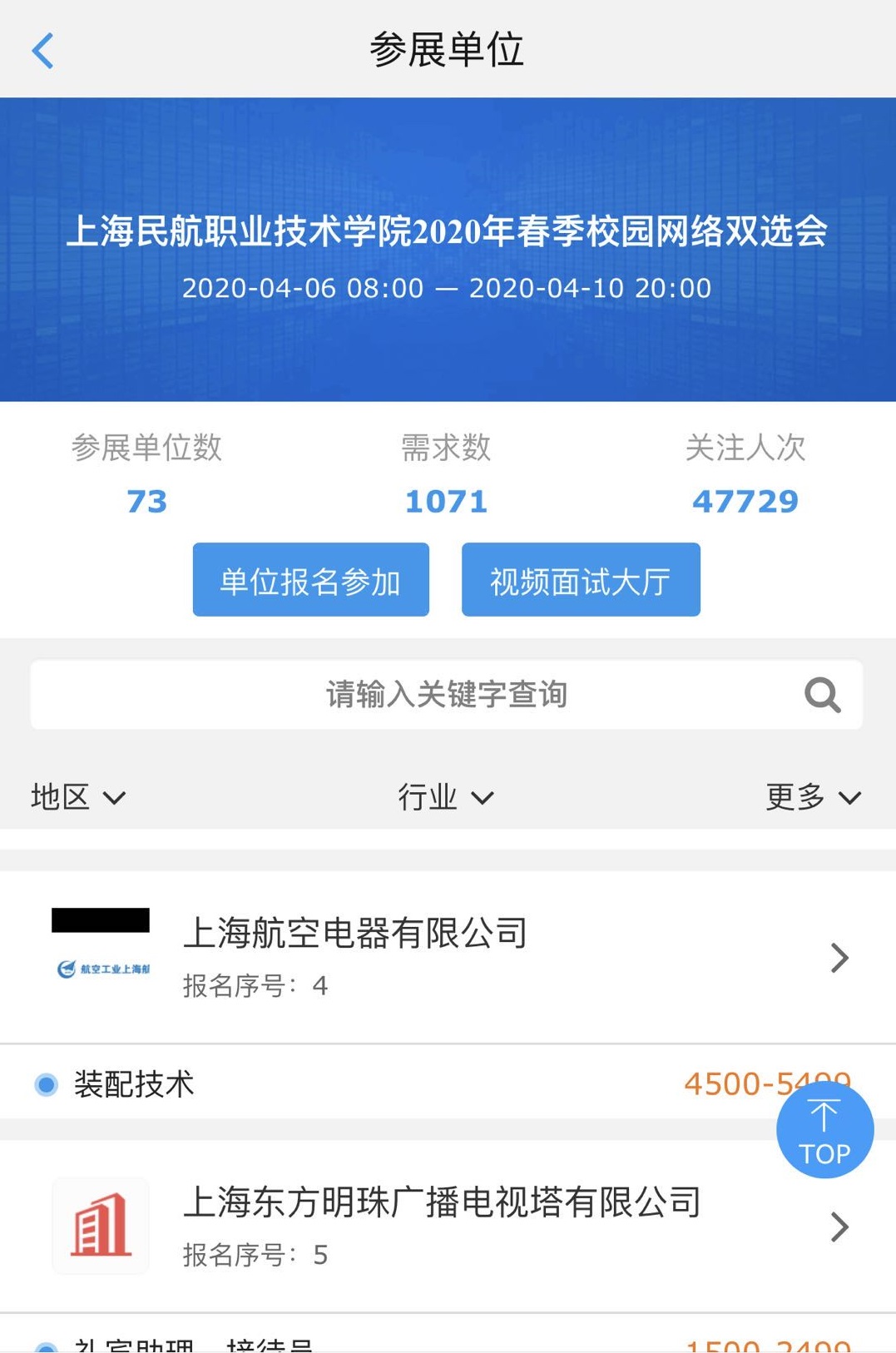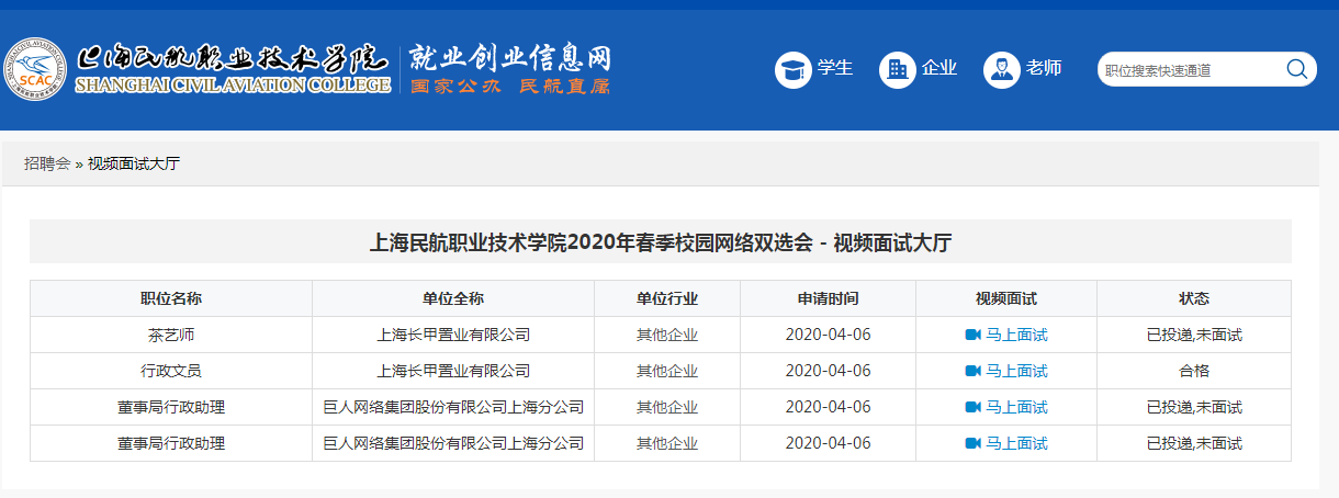 新系统的上线,使学生可以在网络双选会中直接通过手机或电脑一键投递个人简历,并完成初步的个人面试视频上传,不仅可以使企业更好地进行面试初评,同时减少了学生与企业的面试时间和成本,进一步缩短了学生与企业的招聘距离,更快捷高效地实现双向选择。此次双选会后学生工作处就业指导中心将及时跟进参加企业和学生,继续做好各项服务工作,同时也会将报名和面试结果第一时间反馈给各系以便掌握毕业班学生的最新动态。在这之后学生工作处就业指导中心计划将结合上海市学生事务中心以及第三方招聘平台继续在4月、5月、6月继续开展不同主题的网络双选会。