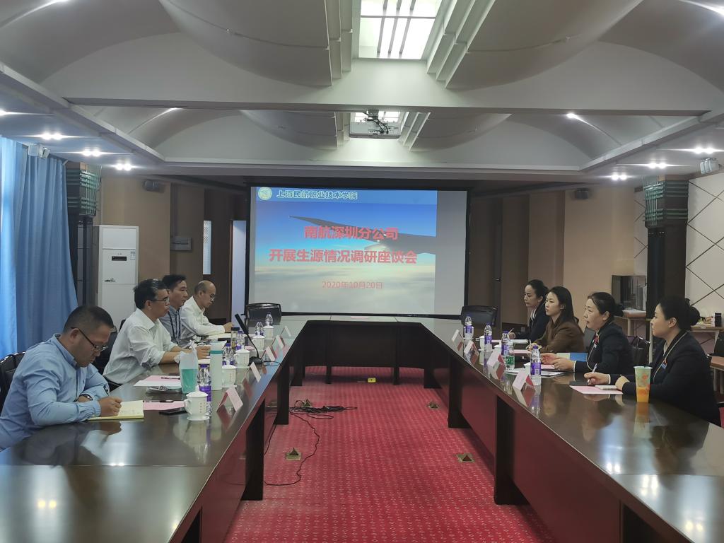 10月20日下午,南航深圳分公司地服部经理李天华、人力资源部招聘主管郭璐、地服培训主管、招聘面试官王维、张忆宁一行4人来到我院浦东校区围绕校企合作开展生源情况调研座谈,我院副院长杨征、航空运输系主任王继华、航空乘务系主任孙军、教务处副处长徐岚以及学生工作处副处长杨必忠参加座谈。