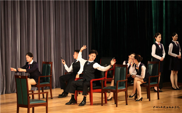 模块三为客舱情景展示。包括团队风采展示和客舱情景演示。小组由6人组成,团队风采展示需要选手融合地域文化、中国文化等元素,展现出乘务员的职业气质;客舱情景展示则有团队成员分饰乘务组和旅客,通过解决客舱冲突和危机,考察选手的专业能力,职业素养和对突发问题的解决能力。该项目有服务类和安全类,通过情景剧的形式展示语言技巧、高度的责任心、警惕性和强烈的客舱安全意识。