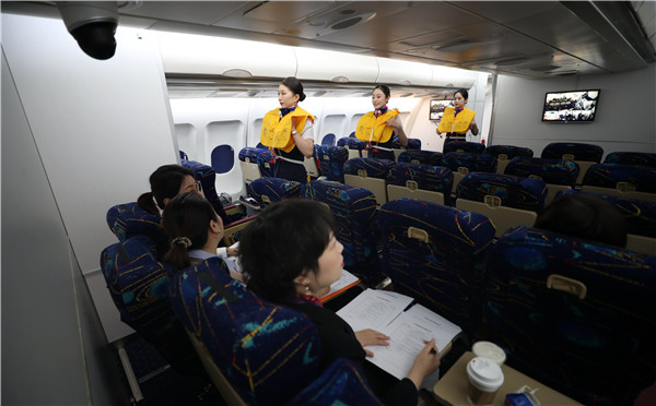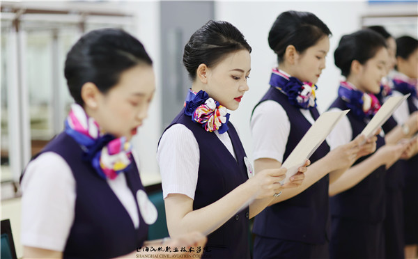 项目二为飞行前安全演示,旨在考察选手在飞行前对客舱安全演示的操作规范性和熟练度。这部分内容也是《客舱服务》课程的核心内容,通过对客舱中救生衣、安全带、应急出口、安全须知卡的使用说明,强化选手的动手能力,提升其团队协作能力和客舱安全意识。