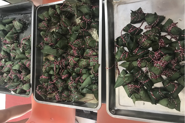 活动中,师生欢聚一堂,师傅们手把手地教学生们包粽子的技巧,不一会同学们就包出来很多粽子。三角形的粽子用翠绿的箬叶包裹着雪白的糯米和鲜红的枣子,又大又好看。有的比较偏爱豆沙的也有喜欢蜜枣的,陷料不同,口感也不同。煮熟以后,剥开箬叶,只见洁白的米团里仿佛嵌着几颗深红油亮的玛瑙,很是好看。粽子的清香缓缓地从锅中溢了出来,嗅着这一丝丝、一缕缕粽香,口水都要流出来了,咬上一口馅,真是甜而不腻,黏而爽口,好吃极了。粽子香味便像烟雾一般向四周弥漫开来,让大家陶醉其中。