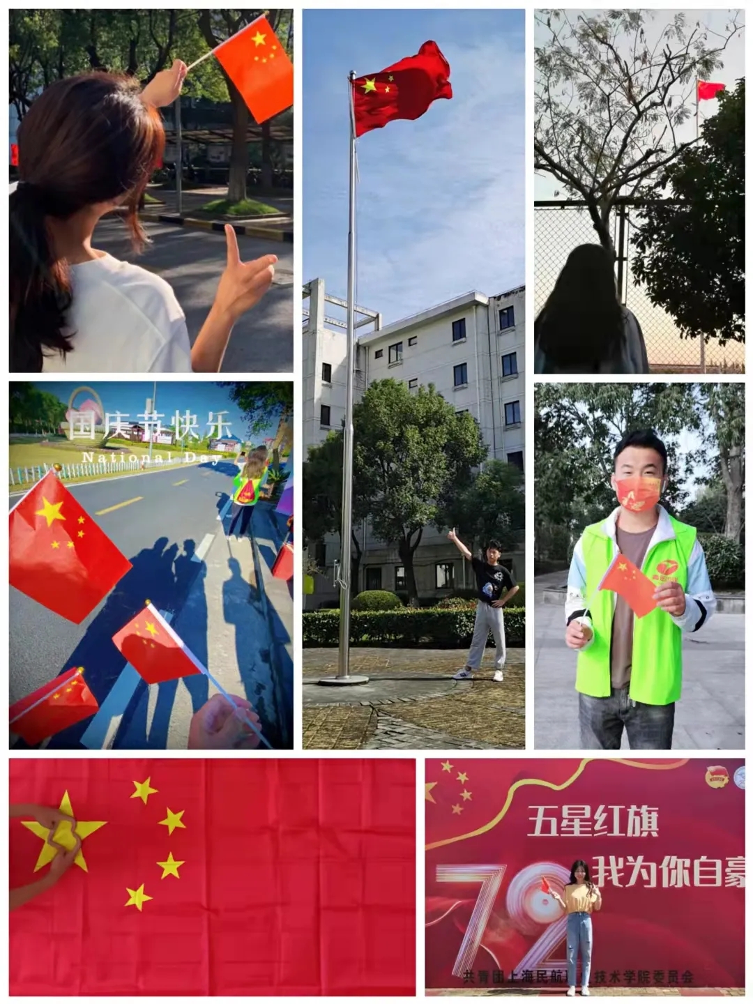 升国旗、与国旗合影、师生篮球赛、客舱擒拿术展示、国庆观影……在刚刚过去的国庆假期里,我院相关二级学院、部分职能部门举办了精彩纷呈的庆祝活动,不仅丰富了留校师生员工的假期生活,更让师生通过活动抒发对祖国、对校园的热爱之情。