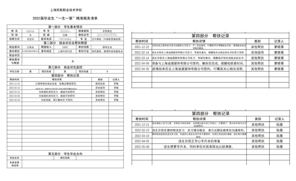 “一生一档”就业帮扶工作,是我院已连续三年开展的一项毕业生帮扶工作。长期以来,在一线辅导员的细心工作下,为每一位毕业学生建立一份个人就业档案。记录了学生的就业状态、帮扶期望以及老师对其的帮扶指导工作。作为一项基础性工作,每一位辅导员老师都倾注的大量的时间和经历,为的就是长期跟踪掌握每一位学生的就业状态和就业意向,为下一步的精准对接帮扶打好基础。
