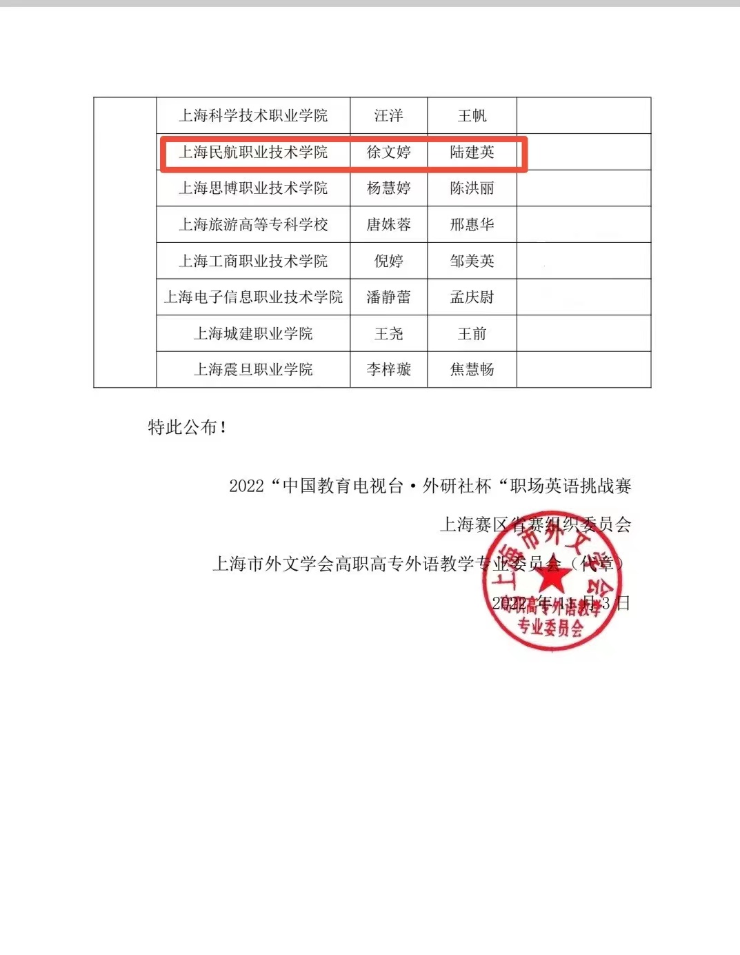 10月30日上午9点, 2022“中国教育电视台·外研社杯”职场英语写作大赛上海赛区的比赛正式拉开帷幕,此次比赛在上海工艺美术职业技术学院(徐汇校区)举行。比赛历时两个小时,经过专家近一周的评审和批改之后,近日比赛结果出炉。我院由外语教研室陆建英老师和施元麟老师指导的民航运输学院2111109班高旸同学、空港管理学院2131201班钟欣晨同学和民航维修学院2146101班徐文婷代表学院参赛,并斩获佳绩。高旸同学荣获上海市一等奖,另两位同学荣获上海市三等奖。