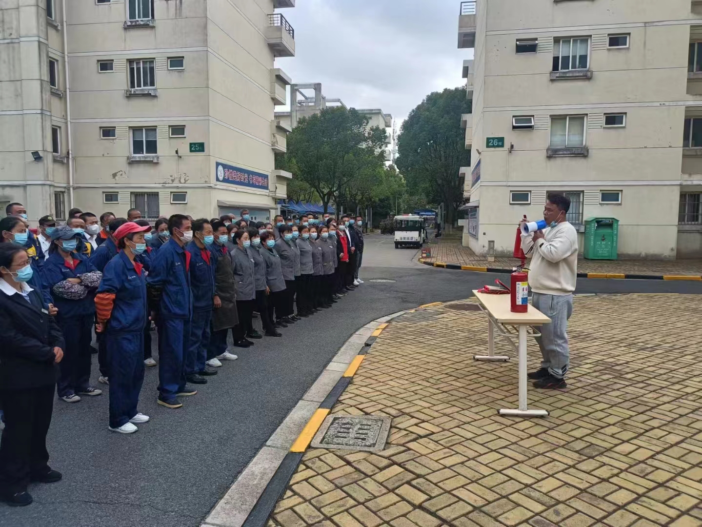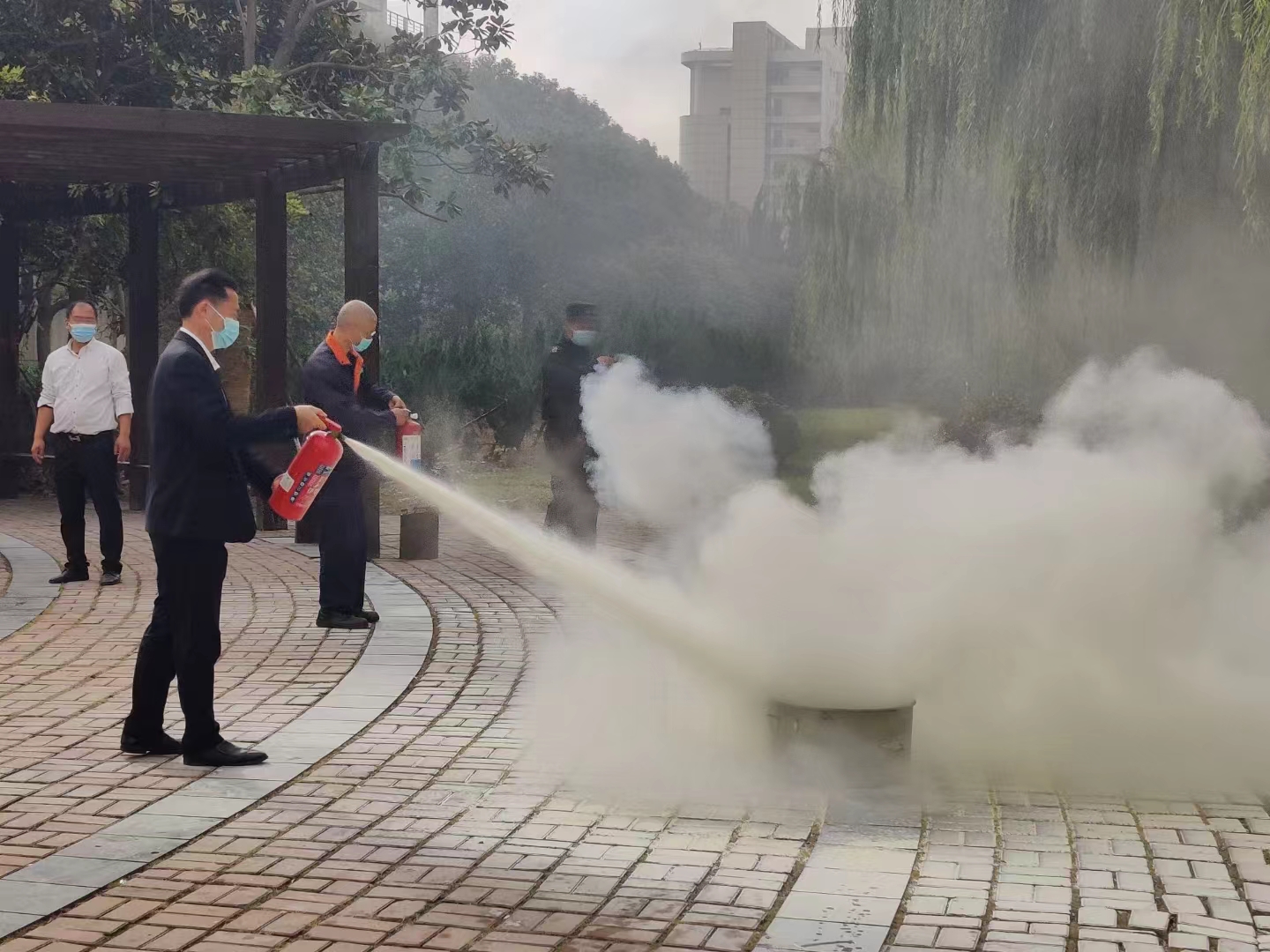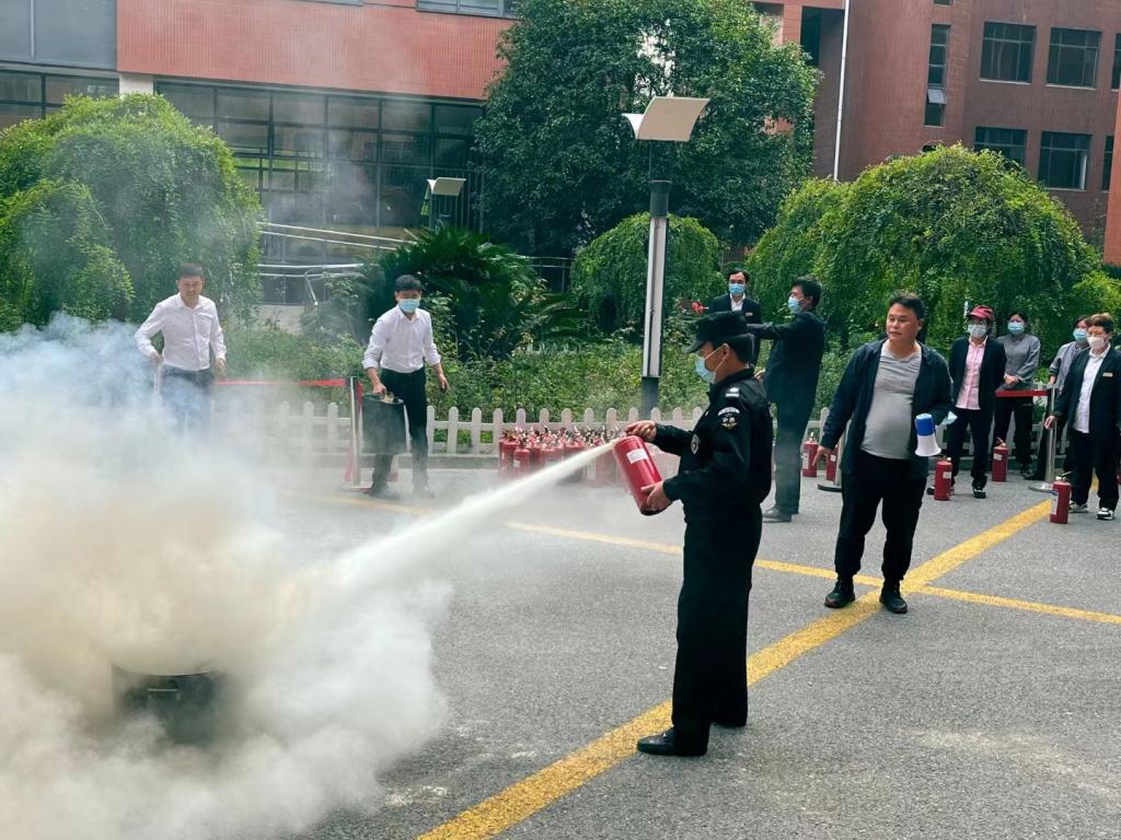 灭火实操演练现场,安全保卫办公室黄福磊老师现场讲解了灭火器的构造、功能、种类、包含成份、使用期限,以及火灾初起时的扑灭和自防自救方法,并进行了现场操作演示。各第三方单位参训人员按照顺序,进行了灭火器灭火操作实景演练,大家态度严肃认真,严格按照灭火流程规范操作,演练取得圆满成功,达到演练预期效果。