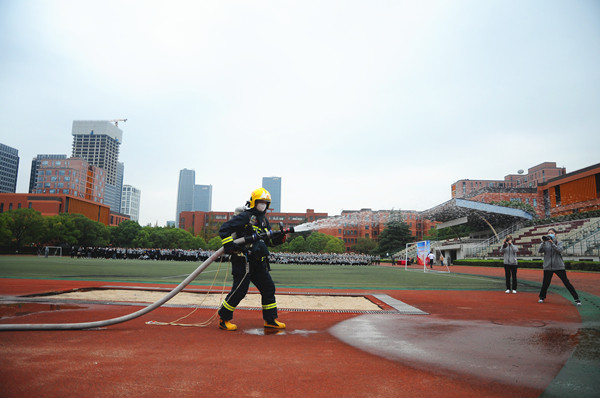 随后,东安路消防救援站进行模拟高空救援、消防车紧急出水展示,以及通过灭火器灭火培训体验的活动方式,宣传消防安全理念,强化火灾警示教育。民航乘务学院徐汇校区的全体学生现场“零距离”体验高空消防救援车、消防车出水,更加贴近、关注和了解消防。整个演练过程紧凑、有序,人员反应迅速,观看演练的同学们全神贯注,场内不断响起热烈的掌声,达到了演练的预期效果。